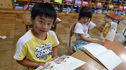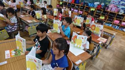 1年2組の国語です。「たからものを おしえよう」の音読をしました。