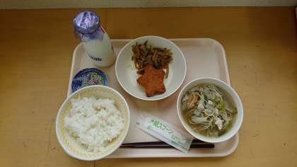ごはん ぎゅうにゅう たなばたじる ほしがたミンチカツ ごもくきんぴら たなばたゼリー
