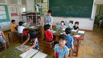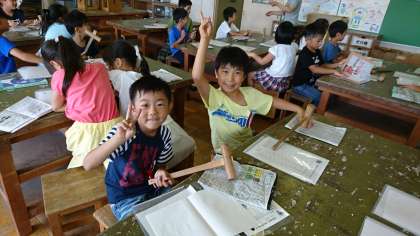 1年2組の生活科です。こちらは,アサガオの花や葉のたたき出しで,作品をつくります。