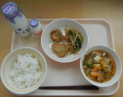 ごはん ぎゅうにゅう ピリカラじる あじのフリッター2こ もやしのナムル はっこうにゅう