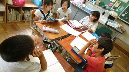 2年2組の算数です。文章問題の解き方を,班で話し合って考えました。