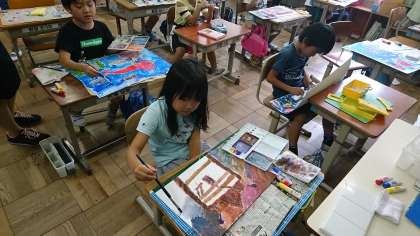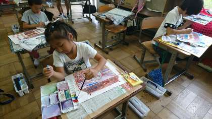 2年2組の図工です。写生をした慈雲寺の色塗りをしました。