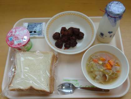 スライスパン ぎゅうにゅう やさいのスープ ミートボールのケチャップかけ ヨーグルト ブルーベリージャム