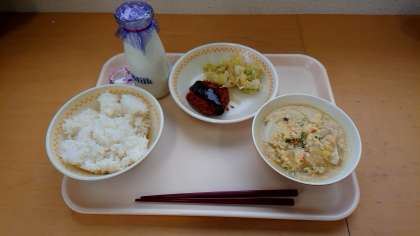 ごはん ぎゅうにゅう かきたまじる ひとくちカツ たくわんあえ プルーン