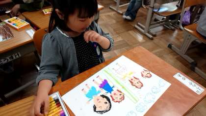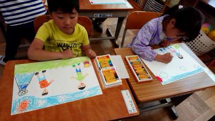 1年2組の図工です。ペア遠足の思い出を絵にかきました。