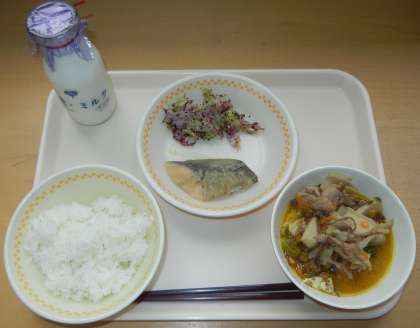 ごはん ぎゅうにゅう ぶたどん さわらのさいりょうやき キャベツのゆかりあえ