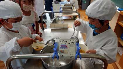 1年1組の給食です。自分たちで配膳を頑張っています 。