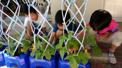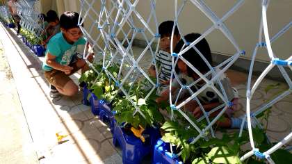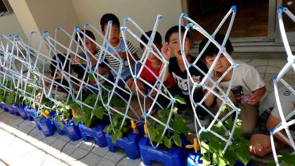 1年3組の生活科です。アサガオがすくすくと育っています。