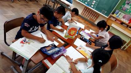 1年3組の国語です。「おおきなかぶ」の音読発表会の準備をしました。
