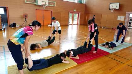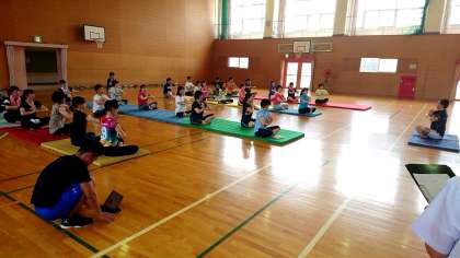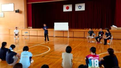 至学館大学の上島先生を講師にお招きして,八幡小学校の体育館で研修会を行いました。