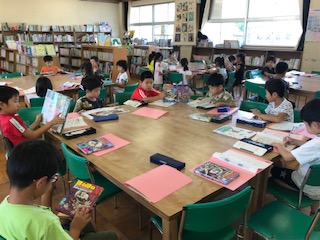 1年生は図書館で、読書に集中していました。「1学期もたくさん読んだので、2学期もがんばろう!」と、担任の先生の言葉に、「よむぞ〜。」と意欲十分!