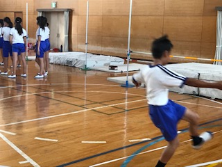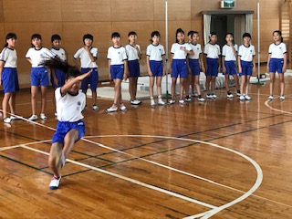 今日は体育館も、とっても暑い。扇風機はフル稼働しているものの、子どもたちの健康面に気を遣いながらの授業となりました。