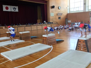 4年生は跳び箱の挑戦タイムです。みんなしっかり手をついて、着地のフィニッシュまで気をつけて、どんどん練習していましたよ。跳び箱は人によっては恐怖がともなう種目、それぞれのペースに合わせて、上手に練習できたね。よく、がんばった!