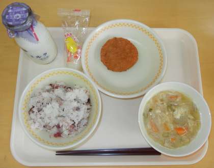 ごはん ぎゅうにゅう うめちりごはんのぐ さといもコロッケ ごじる つきみだんご