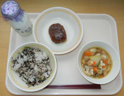 むぎごはん ぎゅうにゅう ツナひじきごはんのぐ ハンバーグのわふうソースかけ とうがんじる