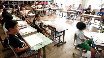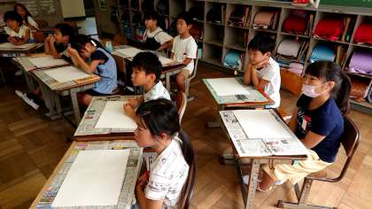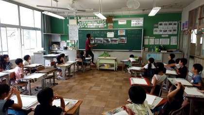 2年1組の図工です。写生会に向けて,絵の描きかたを先生から教えてもらっています。