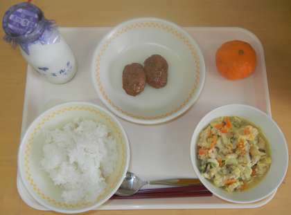 ごはん ぎゅうにゅう レバーいりしろごまつくね 2こ こうやどうふのたまごとじ れいとうみかん
