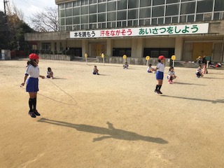 2年生が体育のなわとび運動で、時間跳びをしていました。長く飛び続けられている子をみんなで「がんばれ〜!」と応援していましたよ。なわとび運動は巧緻性(体を巧みに動かす能力)だけでなく、持久力も鍛えられます。冬季に体力をつけるのに最適ですね。
