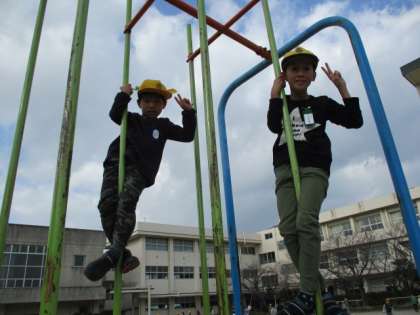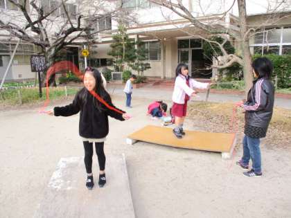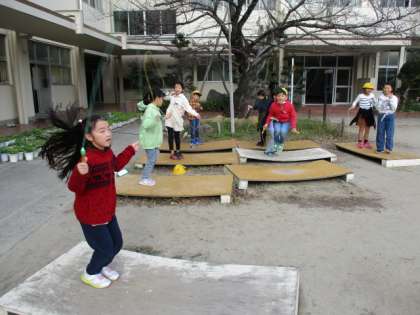 12/12(木)元気に遊ぶ子どもたち 2 公開日 2019/12/12 更新日 2019/12/12 岡田っ子広場 バウンドボード(なわとび練習器)のあたりでは、自分の目標を決めて、なわとびの練習に励む子がいっぱい。登り棒では、こちらを見てピース。