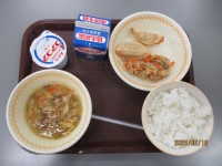 むぎごはん ぎゅうにゅう カレーライス まめまめサラダ(たくじょうマヨネーズ) ふくじんづけ