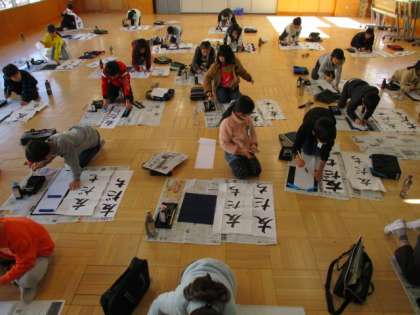 書写で書き初めをしているクラスもありました。私も少し入れてもらって、左はねの仕方を指導しました。伸びやかな字がいいですね。