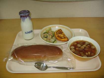 くろロールパン ぎゅうにゅう オムレツ ツナサラダ(たくじょうドレッシング) ミネストローネ