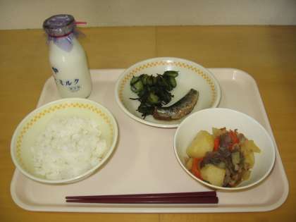 ごはん ぎゅうにゅう いわしのしょうがに にくじゃが きゅうりのこんぶあえ