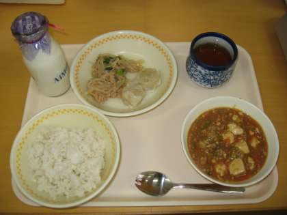 むぎごはん ぎゅうにゅう えびしゅうまい 2こ マーボーどうふ ナムル