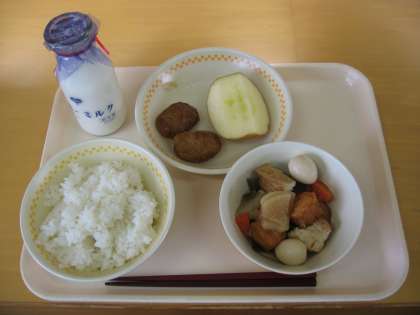 ごはん ぎゅうにゅう レバーいりしろごまつくね 2こ かんとうに りんご