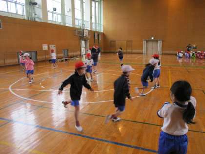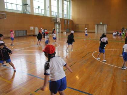 1/27(月)からだつくり 1年生 公開日 2020/01/27 更新日 2020/01/27 1年生 1年生は体育館で、体育の授業でした。先生は今日の目当てを示したあと、ウォーミングアップで「線鬼」をしていました。自然に走るところが決められ、そのように体を動かさなくてはいけないので、巧緻性(思ったように体を動かす身のこなし)が育ちます。とっても楽しそうだったね。