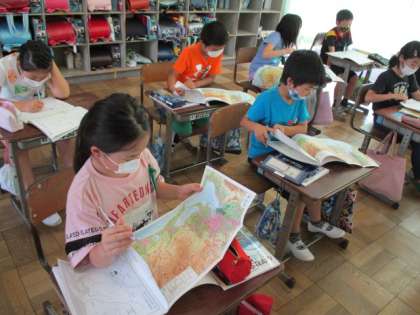 6/15(月)授業風景 4年生 公開日 2020/06/15 更新日 2020/06/15 4年生 4年生も集中して、授業に取り組んでいましたよ。 最近、電子黒板で映像を見せたり、作業を入れたりして、子どもたちが意欲的に取り組む工夫がされているクラスが増えました。 地図に興味をもつと、将来旅行をしたときなどに役立ちますよ。 私は子どもの頃、歴史は大好きだったんですが、地理はどうも苦手でした。