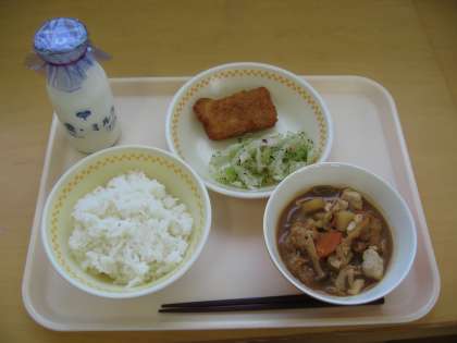 今日の献立は ごはん・ぎゅうにゅう・ささみうめしそフライ キャベツのカラフルあえ・ちたのみそしる です。