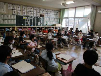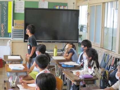 3年生は国語の学習で、物語文にたっぷりと浸って、意見交換していました。とても興味深い授業で、教育実習生も学んでいました。