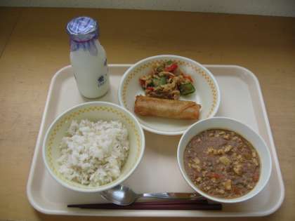 今日の献立は むぎごはん・ぎゅうにゅう はるまき・マーボーどうふ きりぼしだいこんのあえもの です。
