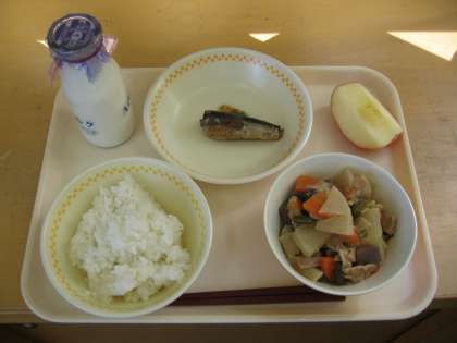 今日の献立は ごはん・ぎゅうにゅう いわしのうめしょうゆに ぶたにくとだいこんのにもの・りんご です。