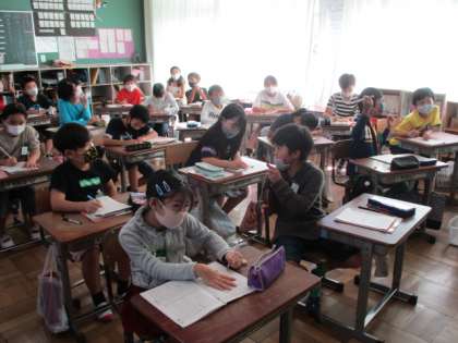 4年生は国語で、「ごんぎつね」の読解に取り組んでいました。郷土の誇る新美南吉さんの作品です。しっかり読み味わいましょう。廊下には、素敵な作品が飾られていましたよ。