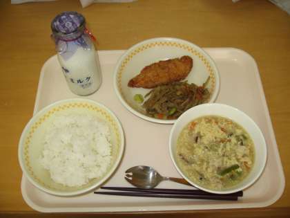 今日の献立は ごはん・ぎゅうにゅう・サーモンフライ きんぴらごぼう・かきたまじる です。