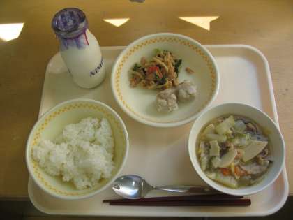 今日の献立は ごはん・ぎゅうにゅう・しゅうまい2こ チンゲンサイのちゅうかあえ・はっぽうさい です。