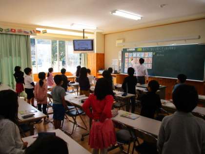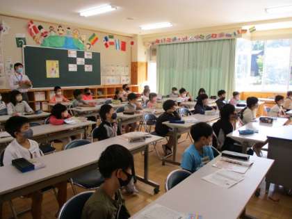 3年生は外国語教室で、外国語(英語)の授業に取り組んでいました。今年からの外国語の授業ですので、アルファベットをしっかりと覚える内容でした。最後は歌にして確認しましたね。発音、なかなかよかったですよ。