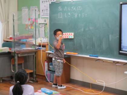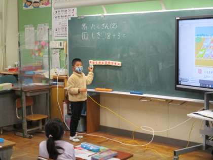 10/23(金) 授業風景 1年生 2 公開日 2020/10/23 更新日 2020/10/23 1年生 算数の授業で、自分の考え方を発表していました。先生は、上手に発問を重ね、その子の考え方を引き出していきました。操作しながら説明できていて、感心でしたよ。