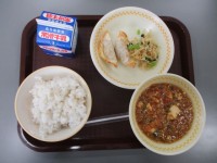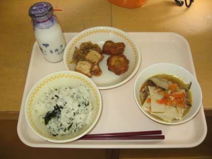 今日の献立は わかめごはん・ぎゅうにゅう いかフリッター 2こ なまあげのみそいため ワンタンスープ です。
