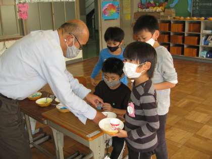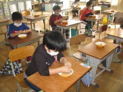 ひまわり学級では、せっけん作り。「どれにしようかな」好きな色の材料を選んでいます。また、別の教室では「ポップコーン作り」の準備で、一つ一つ丁寧に実をはずしていました。「こぼさないように」