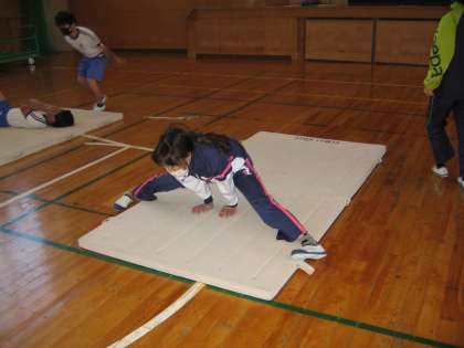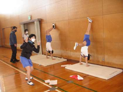6年生は、体育館でマット運動の授業。開脚前転・倒立……、いろいろな技を披露してくれました。