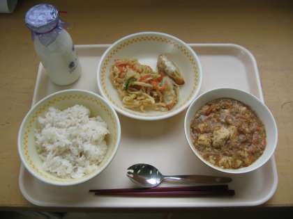 今日の献立は むぎごはん・ぎゅうにゅう やきぎょうざ2こ マーボーどうふ きりぼしだいこんのあえもの です。