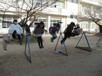 大放課に中庭へ行ってみると、“鉄棒女子”に出会いました。すごいんですよ。前回りや後ろ回りの連続技をびゅんびゅんと…。後ろ回りはできる子が多いのですが、前回りは難しく、できる子は少ないんです。鉄棒のスキルもさることながら、目が回らないのもすごいな〜。若さかな〜。私などは、すぐに気持ちが悪くなるやら、星が出るやら…。