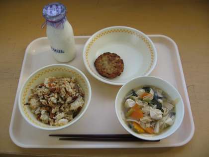 今日の献立は、 ごはん・ぎゅうにゅう うなぎちらしのぐ キャベツいりつくね とうふとゆばのすましじる です。
