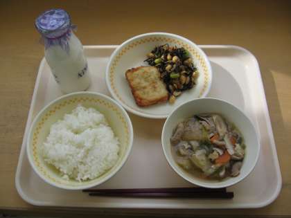今日の献立は ごはん・ぎゅうにゅう チキンたつたあげ ひじきとだいずのいために とうがんじる です。