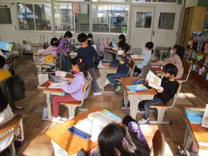 1年生は算数や国語、図工の授業に取り組んでいました。図工の作品作りでは、息を吹き込むと膨らむビニールを生かして、面白い作品ができていました。子どもたちからは「楽しい〜!」というつぶやきが聞かれましたよ。