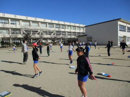 1/18(月) 授業風景 5年生 公開日 2021/01/18 更新日 2021/01/18 5年生 5年生は青空の下、運動場で体育の授業でした。縄跳び運動でしたが、いろいろな跳び方を音楽にのせて試しました。とっても楽しそうでしたよ。