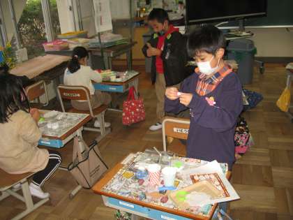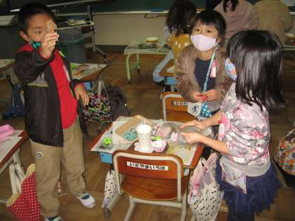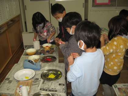 1/28(木) 授業風景 1年 公開日 2021/01/28 更新日 2021/01/28 1年生 1年生は「ごちそうパーティー」の準備。サーモンのおすし・星形クッキー・ケーキに三色団子……。五平餅もありました。紙粘土を使って、とてもおいしそうな「ごちそう」を作っています。